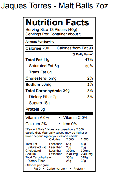 Malt Balls - (MALTED CENTERS (CORN SYRUP, SUGAR, DAIRY BLEND (WHEY, WHEY PROTEIN CONCENTRATE), MALT POWDER (MALTED BARLEY, WHEAT, MILK, HYDROLYZED WHEAT GLUTEN, SODIUM BICARBONATE, SALT), MALTED BARLEY, SOY LECITHIN, SALT.) Confectioner's Glaze.